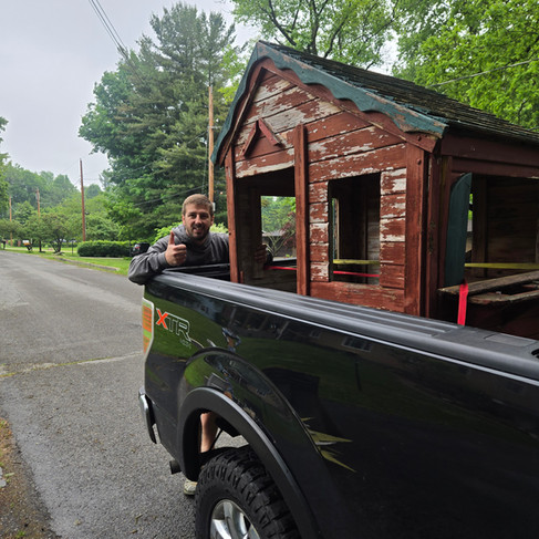As usual, Paige was all in. She never hesitates when I get an idea like this. The playhouse was so unstable when we picked it up that the wall started falling off as we loaded it into the truck. My mom caught it all on videoâincluding me joking around pretending I was stuck inside the âtavern.â That clipâs a keeper.