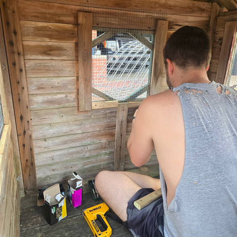 Windows framed with furring strips and covered with hardware cloth + clear plastic for ventilation and weatherproofing